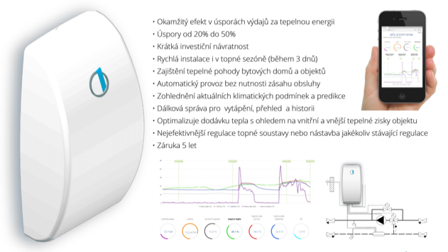 Za vším stojí nový typ regulace. Je to taková  umělá inteligence regulačních a topných soustav, která regulaci topné soustavy přizpůsobuje stanovenému tepelnému komfortu daného objektu. Počítá s vnějšími a vnitřními tepelnými zisky s využitím předpovědi počasí v reálném čase. Myslí za Vás, řídí za Vás a šetří Vám.