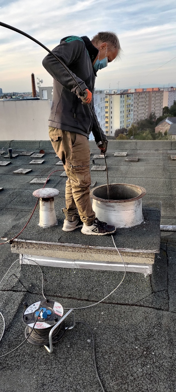 Nabízíme čisté a rychlé vložkování – opravy dešťových svodů (stávajících litinových, azbestových, plastových či betonových) z rovných střech bytových domů, které jsou postupem času porušeny, netěsní a dochází k průsaku a zatékání v místech tohoto porušení a spojů do budovy. Provedení opravy během jednoho dne. Bez bourání a bez nutnosti přístupu do bytů.