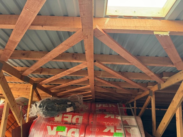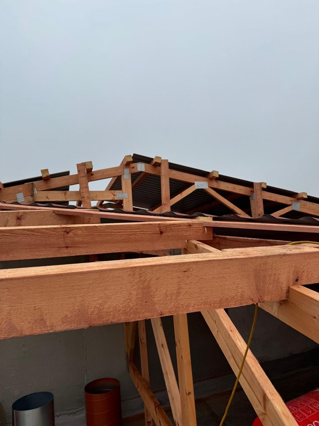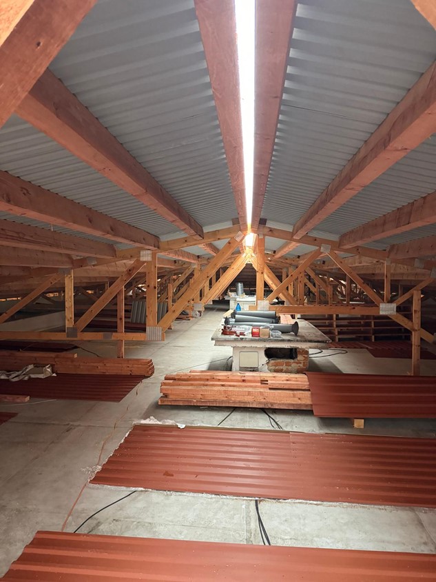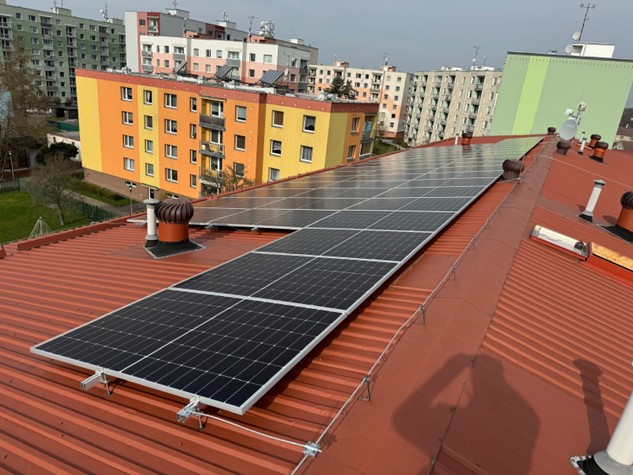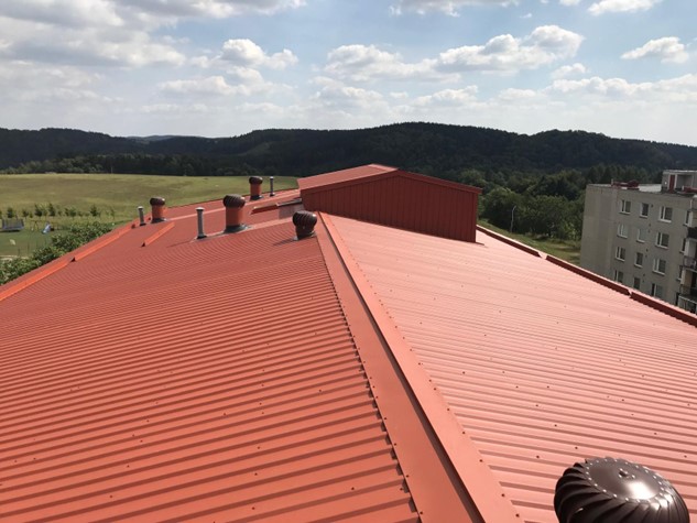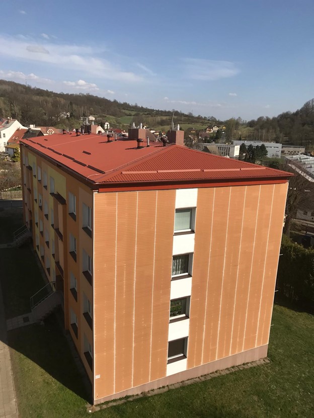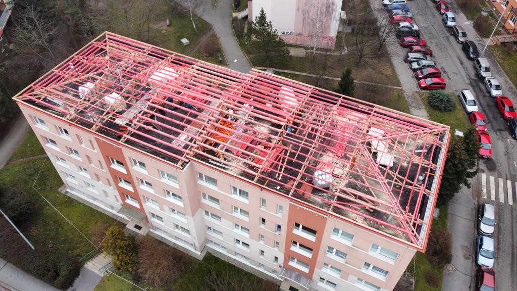 - jedná se o rekonstrukci stávajících plochých střech bytových domů, kdy se na původní plochou střechu domu umístí nová dřevěná konstrukce tvořená dřevěnými příhradovými vazníky. Tyto jsou umístěny tak, aby kopírovaly nosný systém objektu (nad každou příčnou nosnou stěnou domu, u podélného modulu v závislosti na statickém návrhu). Vazníky jsou následně provázány systémem horizontálních vaznic kladených v dané rozteči, dle statického návrhu. Celá konstrukce krovu je již od počátku dimenzována pro možné umístění FV panelů. Jako krytinu používáme bezúdržbové trapézové plechy od finské firmy (RUUKKI) se zárukou od 15 do 50 let dle zvolené povrchové ochrany (v 99% realizací používáme nejvyšší povrchovou úpravu s polyuretanovým lakem s označením 50+).