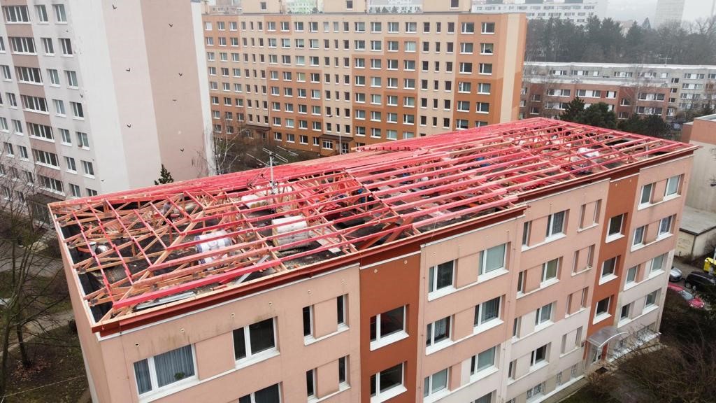 Naše firma se specializuje na rekonstrukce problémových plochých střech bytových domů formou přestavby na bezúdržbové sedlové (valbové) střechy s nízkým sklonem s možností montáže FV panelů.