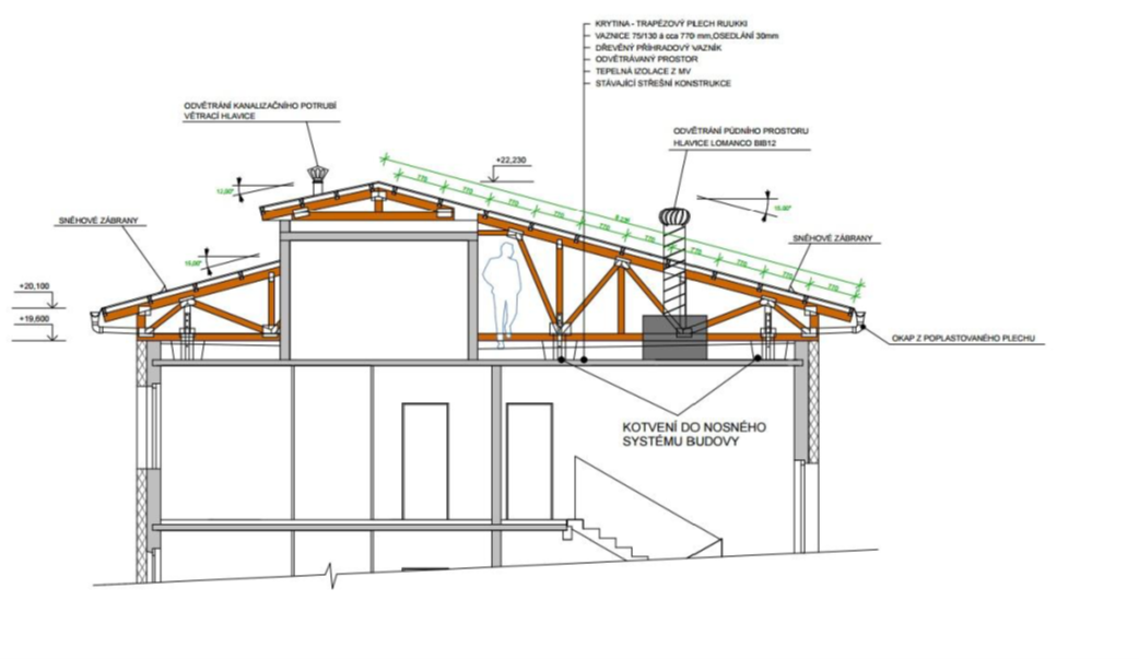 Řez střechy se strojovnou výtahu