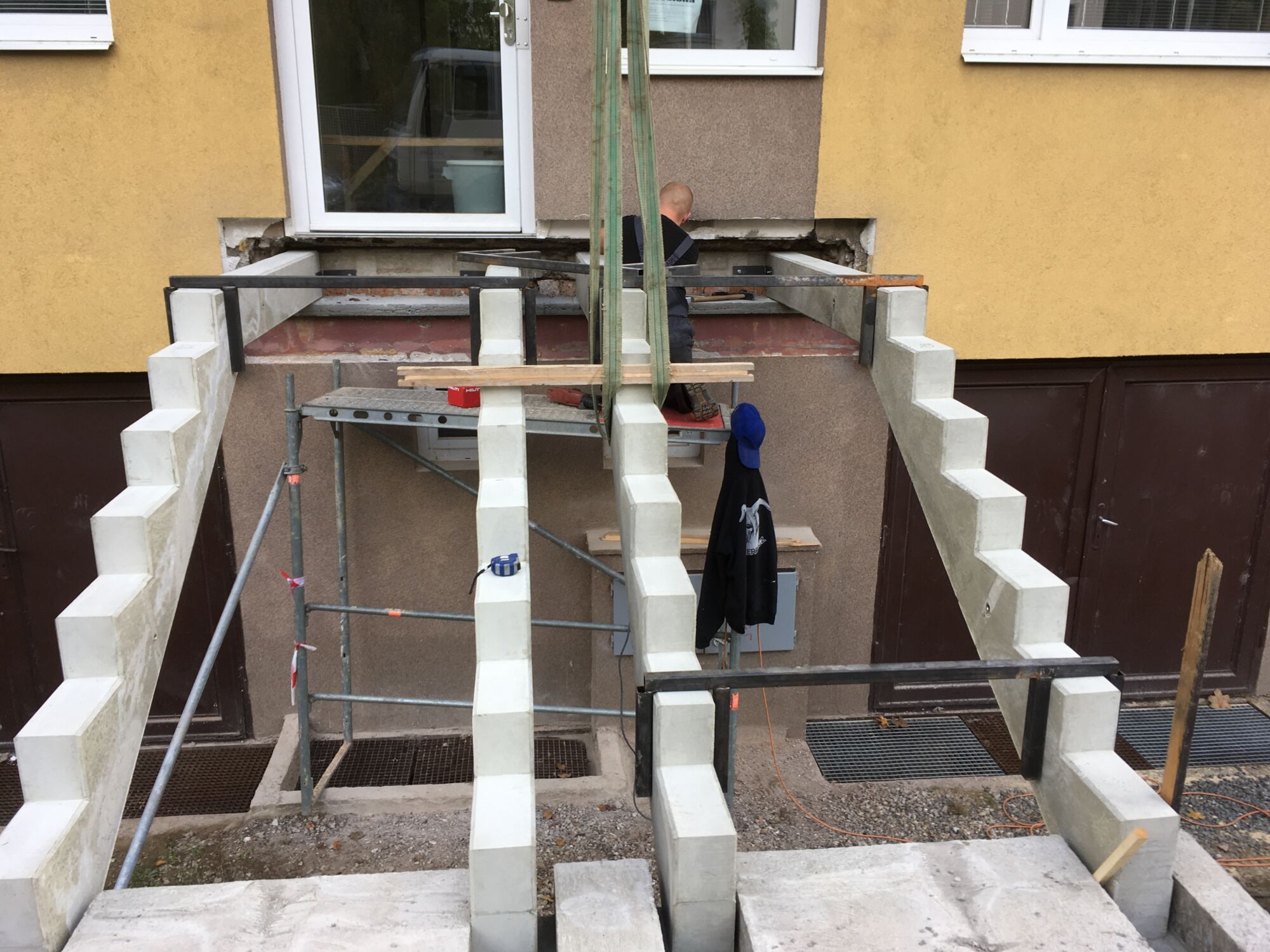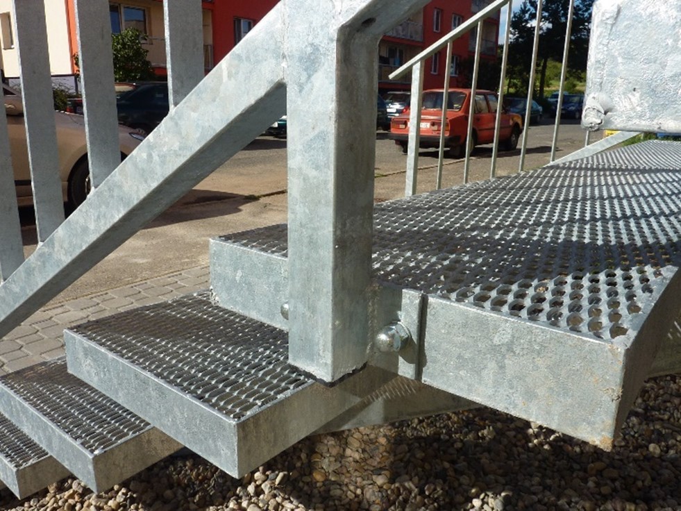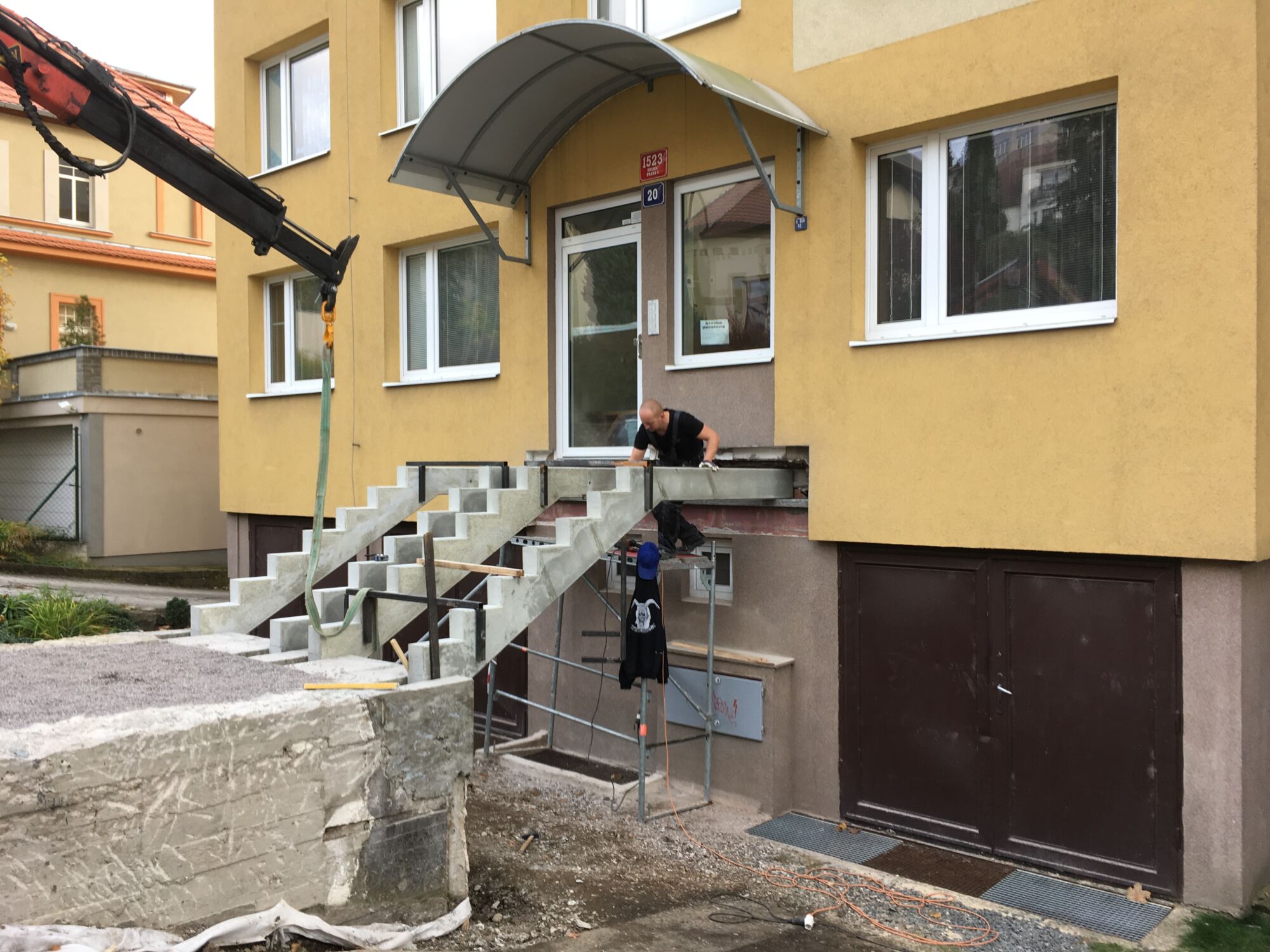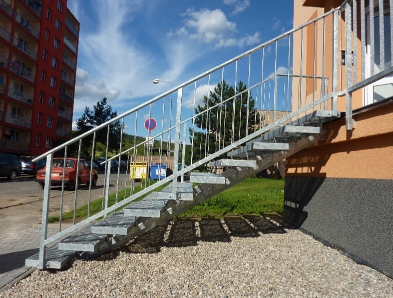 Renovace začíná vždy bouracími a zemními pracemi, kdy se připravuje podklad pro montáž nového schodiště. Po odstranění starého schodiště a dokonalé přípravě podkladu přichází na řadu montáž nosné ocelové konstrukce s povrchovou úpravou žárové zinkování (jako alternativní řešení můžeme použít betonový prefabrikát), na kterou se montují jednotlivé schodišťové stupně. Zde je kladen velký důraz na pochozí plochu, která má zásadní vliv na bezpečnost uživatelů hlavně v extrémním nepříznivém počasí. Z těchto důvodů doporučujeme použití protiskluzné mrazuvzdorné betonové dlažby na podesty, betonových prefabrikovaných schodišťových stupňů včetně protiskluzné hrany nebo použití ocelových pozinkovaných roštů. Mimo montážní práce je potřeba provézt také související zednické a fasádní práce, které samozřejmě provádíme v celém rozsahu jako součást díla, tím zákazník nemusí řešit dodatečné smluvní vztahy s dalšími dodavateli.