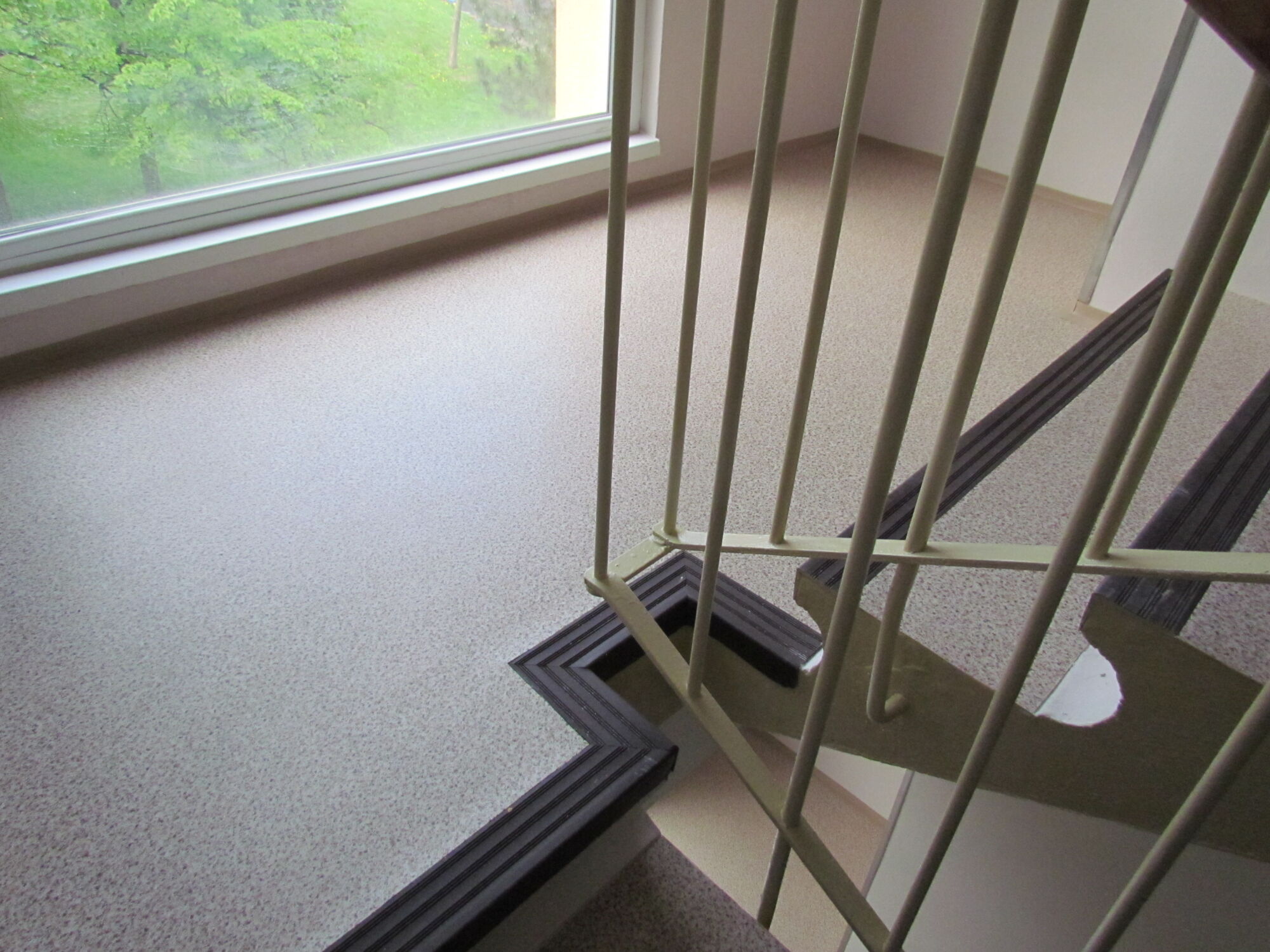Existuje řada podlahových krytin, u bytových domů používaných jde převážně o PVC nebo keramickou dlažbu. Obě mají své výhody a nevýhody. Když mluvíme o PVC, máme na mysli heterogenní podlahovou krytinu splňující vysoké nároky na zátěž a neustálý pohyb, nabízí vzhledově více variant, reakce na oheň Bfl-s1 a patří do kategorie protiskluzných podlahovin ve skupině R11. Nevýhodou oproti dlažbě je menší odolnost proti mechanickému poškození.