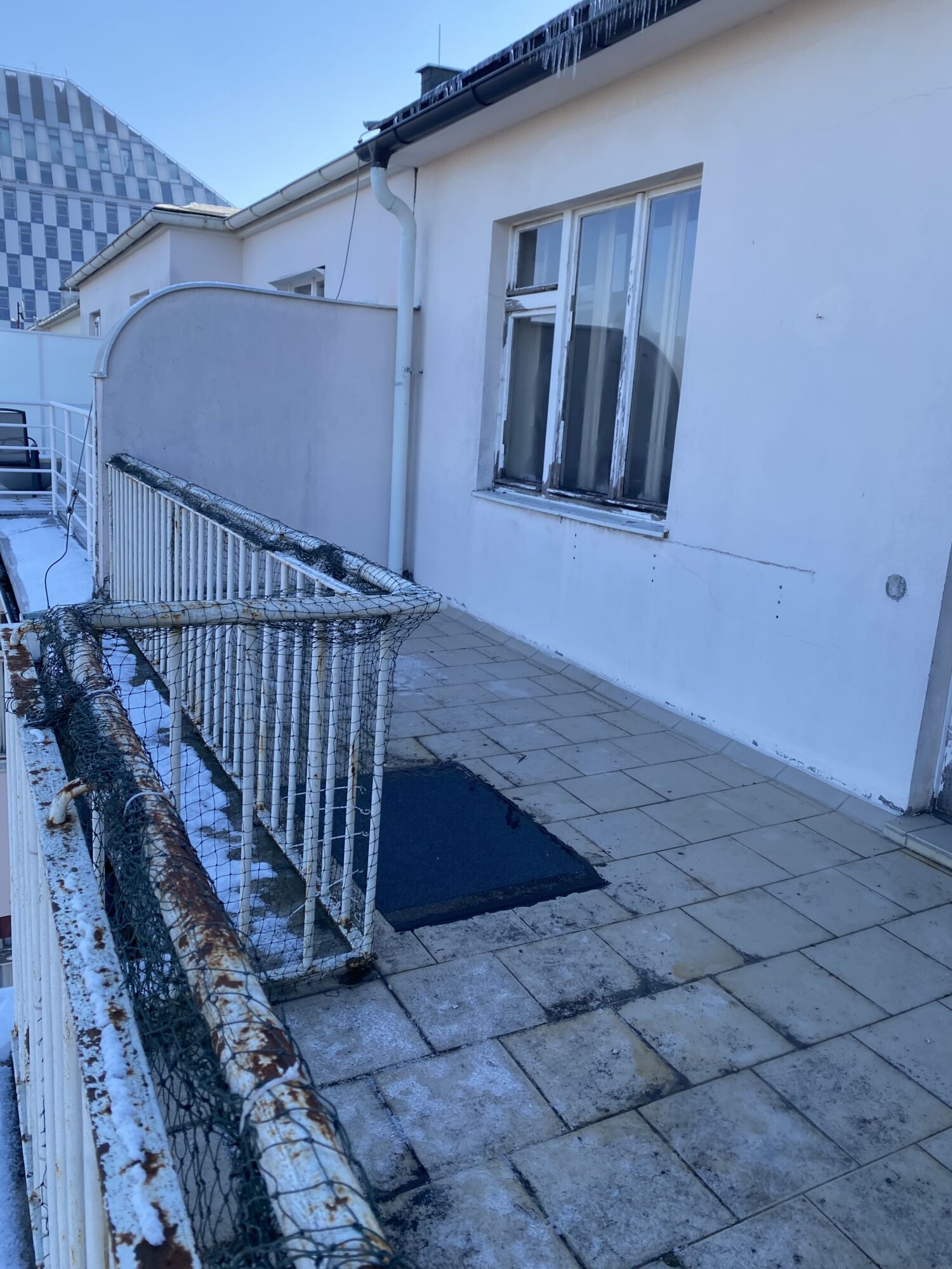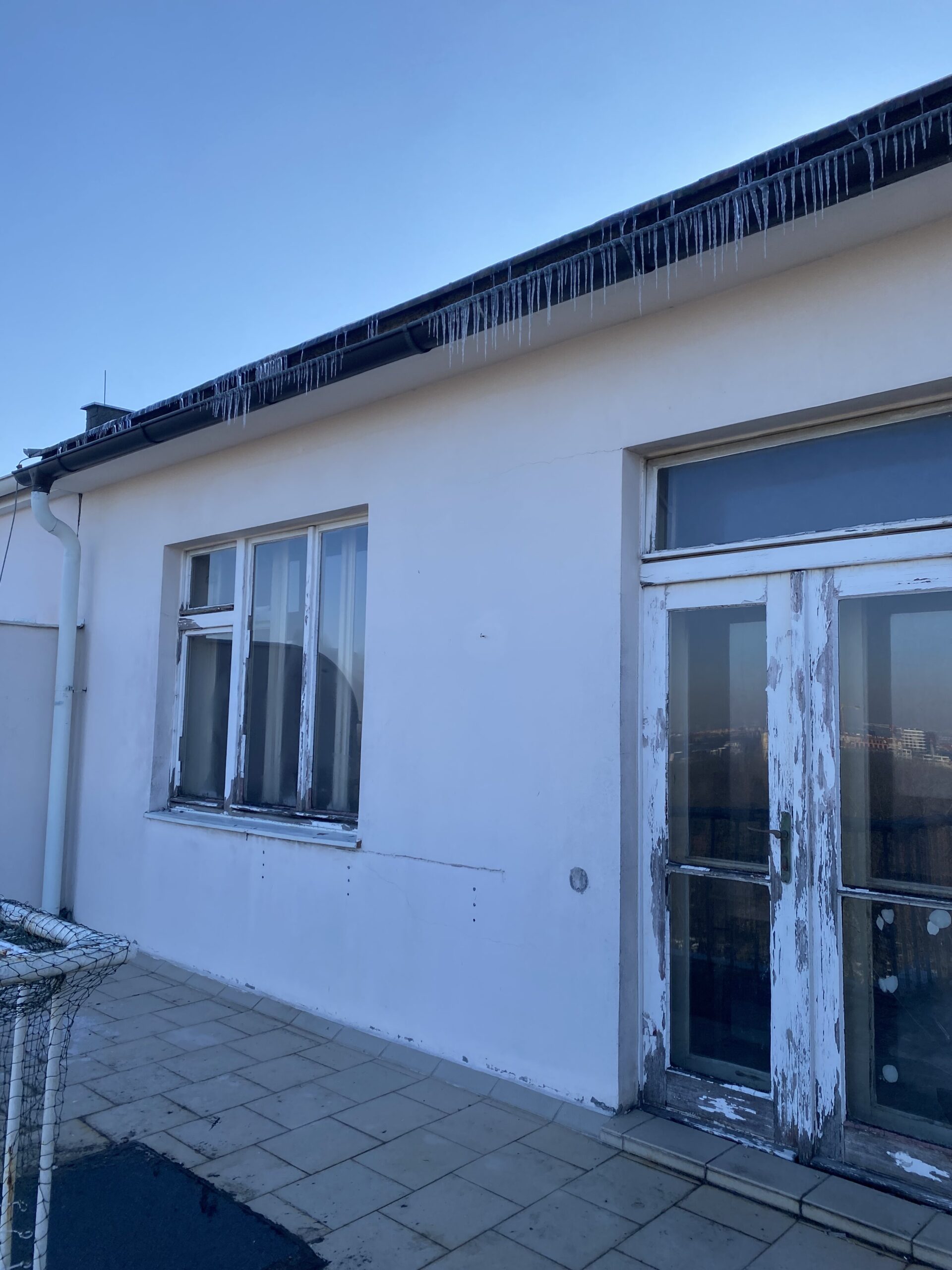 Střešní krytina z asfaltové lepenky je na konci své životnosti, místy popraskaná a střecha jako celek je před kompletní opravou. Zhoršený stav je umocněn zastaralými klempířskými prvky a ucpanými dešťovými svody, kde dokonce dochází k tvorbě ledu, což může ohrozit spodní terasy a fasádu domu.