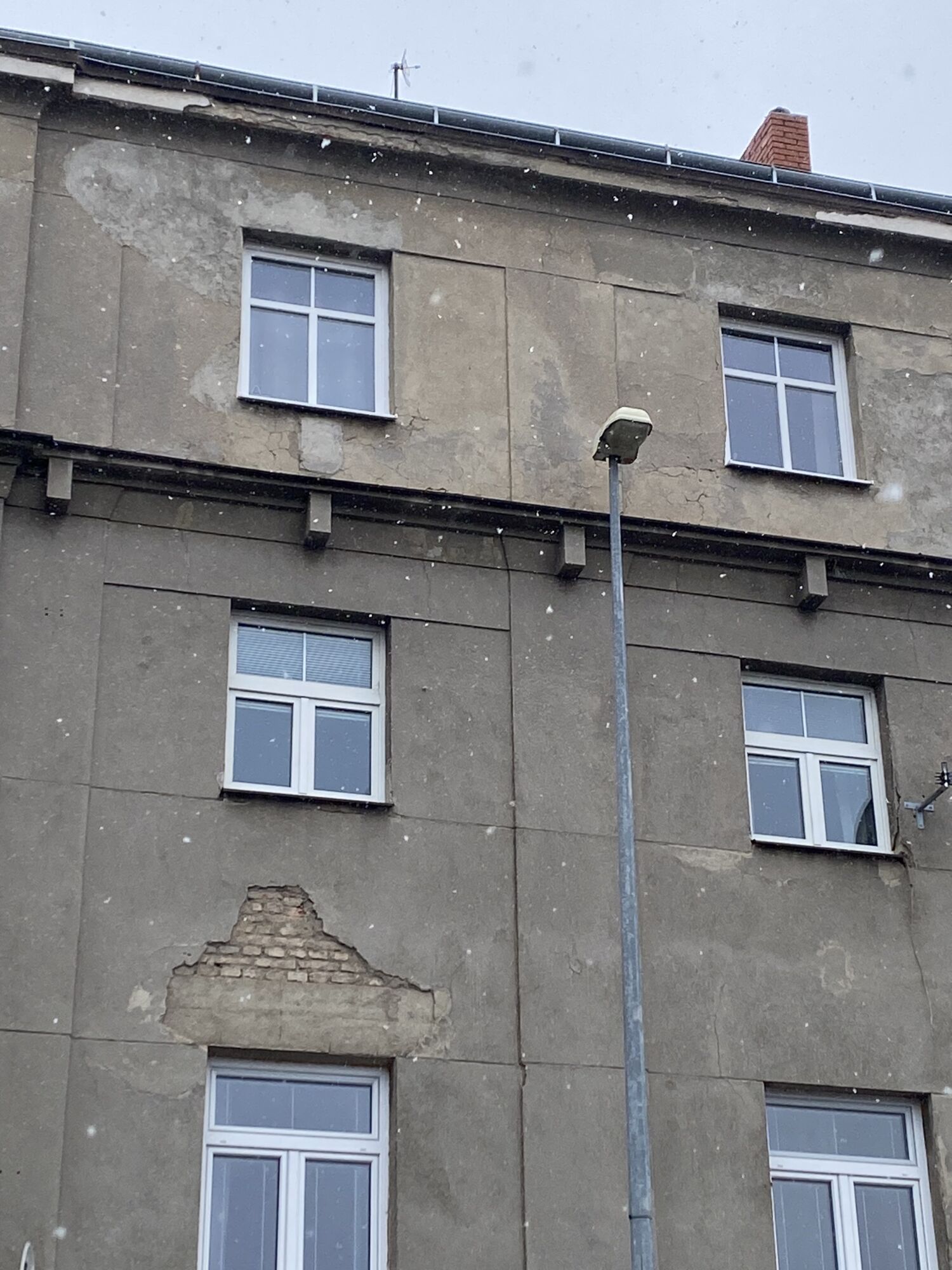 Uliční fasáda je v havarijním stavu a představuje přímé riziko pro chodce. Omítka i části říms jsou uvolněné, hrozí jejich pád na veřejný chodník. Dvorní část objektu sice byla zateplena, avšak uliční fasáda trpí výraznými tepelnými mosty, kvůli nimž se v bytech tvoří mokré skvrny a plísně.
